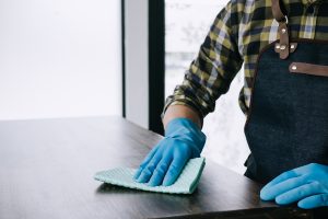 Husband housekeeping and cleaning concept, Happy young man wipin